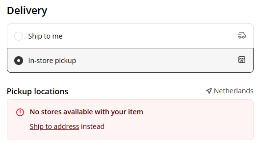 When you proceed to checkout, your country will be automatically detected and set. As a result the checkout will report that there are no stores available with your item(s).